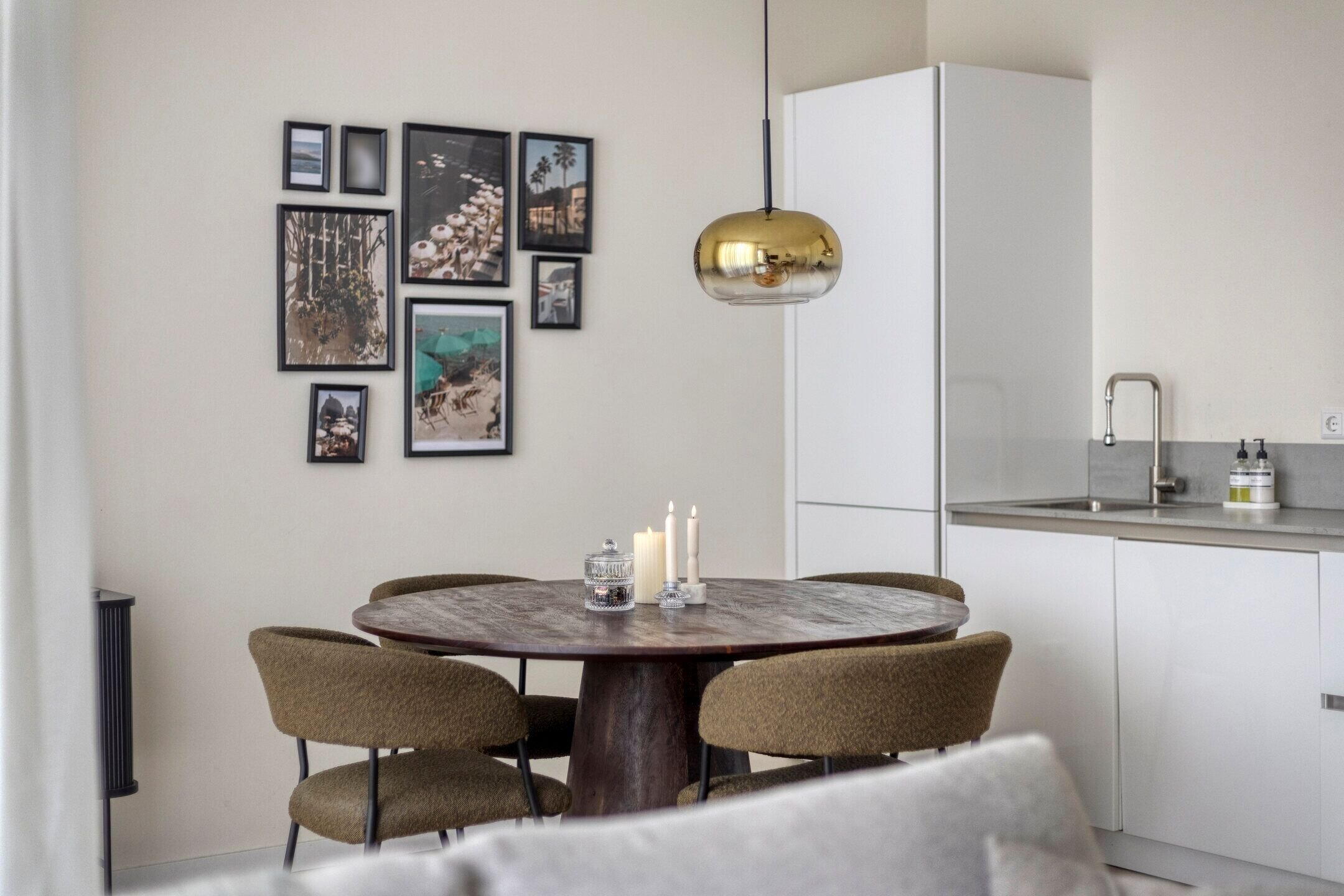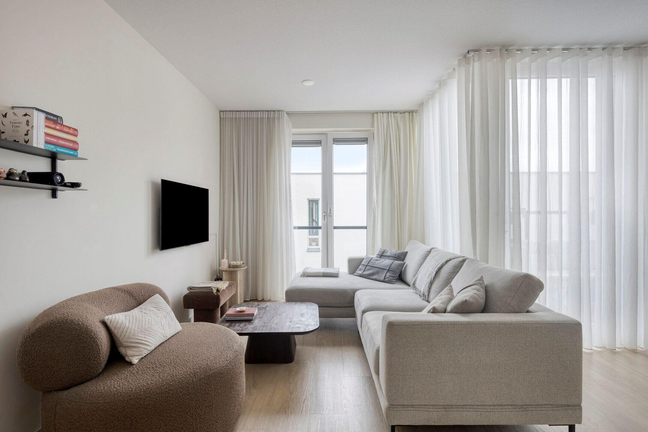 De woonkamer met open keuken is heerlijk licht door de vele raampartijen en heeft direct toegang tot het balkon aan de voorzijde. De moderne keuken is voorzien van diverse inbouwapparatuur, waaronder een inductiekookplaat, afzuigkap, koelkast, combioven en vaatwasser.